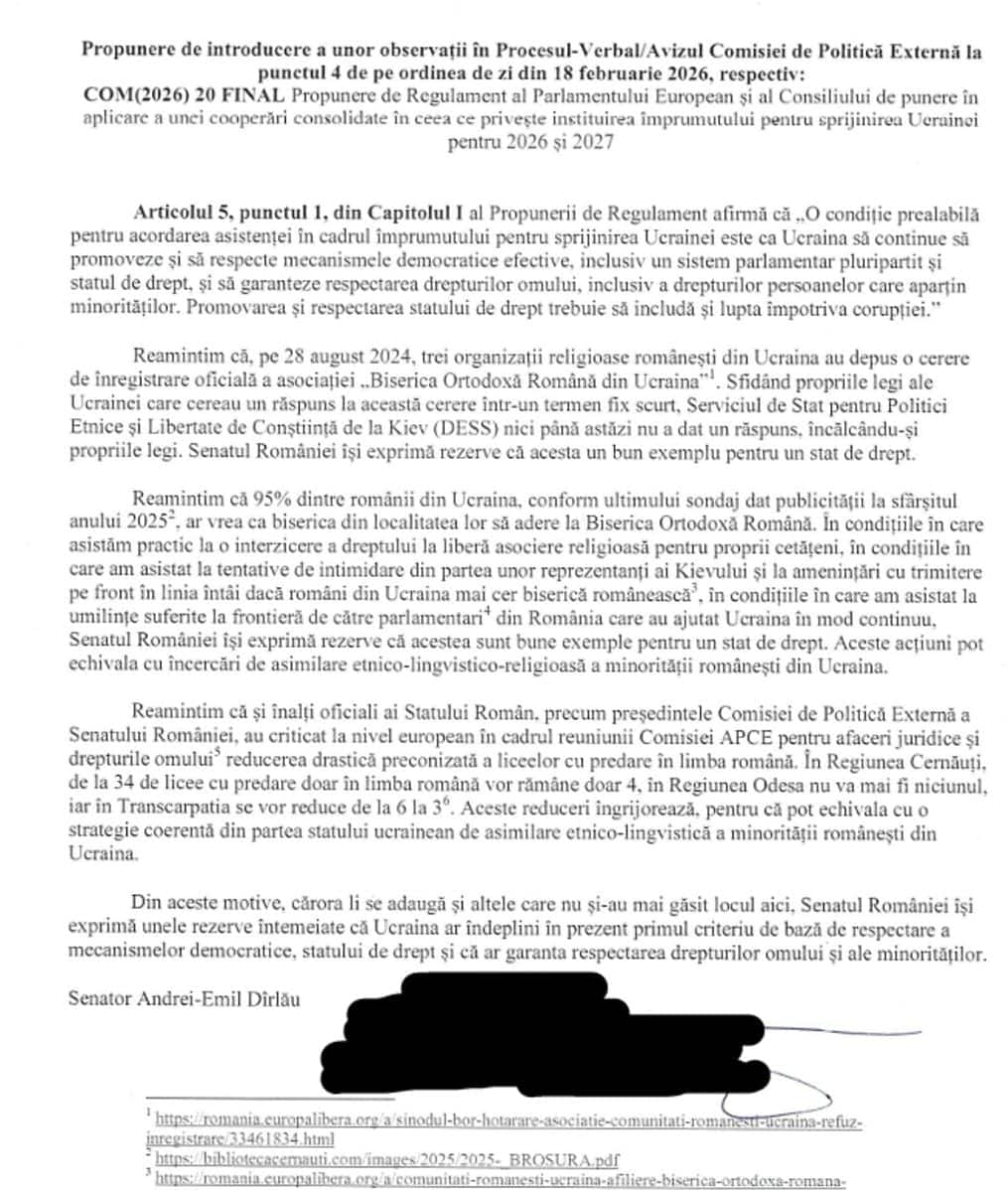 Senatorul AUR, Andrei Dîrlău, acuză conducerea Comisiei de Politică Externă a Senatului că a refuzat să consemneze, în ședința din 23 februarie 2026, observațiile transmise de reprezentanții AUR privind drepturile lingvistice și religioase ale etnicilor români din Ucraina.