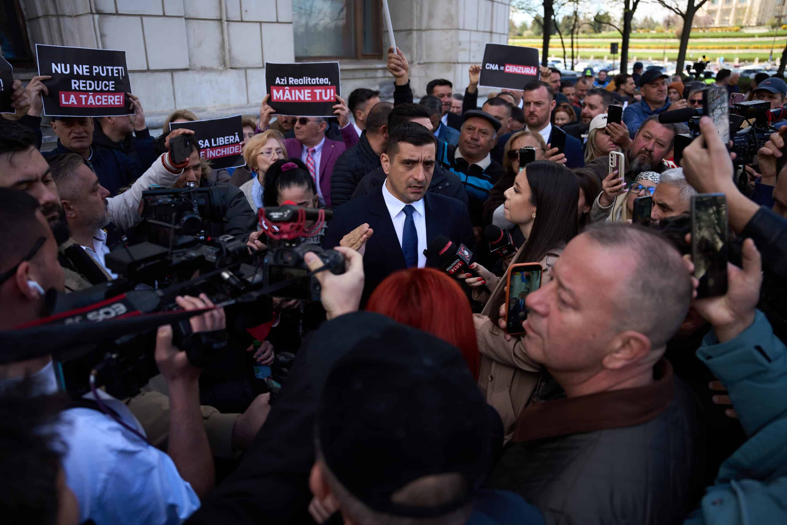 Președintele AUR, George Simion, a fost prezent miercuri, 8 aprilie, la sediul Consiliul Național al Audiovizualului (CNA), alături de parlamentarii AUR, pentru a protesta împotriva deciziei abuzive de retragere a licenței de emisie pentru instituțiile de presă Realitatea Plus TV și Gold FM.