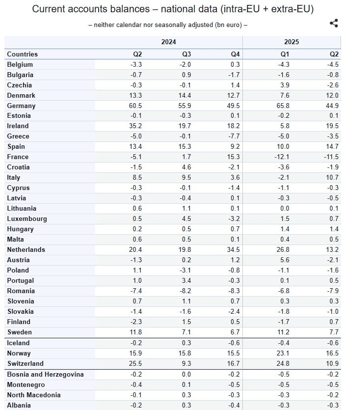 „În trimestrul II al acestui an, în România au intrat cu 8 miliarde de euro mai puțin decât au ieșit. Avem, cu alte cuvinte, un deficit de cont curent de 7,9 miliarde de euro numai în perioada aprilie iunie 2025. Singurul stat european care are un deficit de cont mai mare decât al nostru este Franța, care a marcat un minus de 11,5 miliarde. Să nu uităm însă că Franța este o economie de vreo 5-6 ori mai mare. Și se află în cea mai profundă criză economică și politică din acest secol, o criză cum nu a mai avut de pe vremea primului mandat al lui Mitterand.