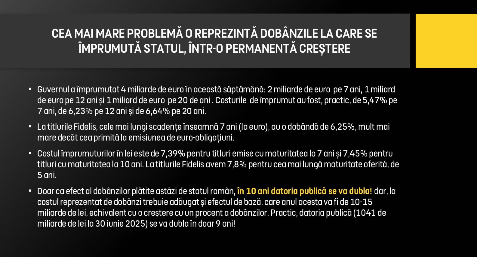 „Săptămâna trecută, Guvernul a împrumutat 4 miliarde de euro: două miliarde pe scadența la 7 ani,  un miliard pe scadența la 12 ani și unul pe scadența la 20 de ani. Aveți aici dobânzile la care s-a împrumutat, ele sunt date ca primă față de dobânda de referință Midswap-ul și avem aproape 5,5% pe șapte ani în euro, 6,25% pe 12 ani și 6,65% pe 20 de ani. Prin comparație, împrumuturile pe care le face statul român pe piața internă, prin titlurile Fidelis la euro, cea mai mare maturitate este cea de șapte ani, 6,25%. La lei costul împrumuturilor era vineri 7,45%.
