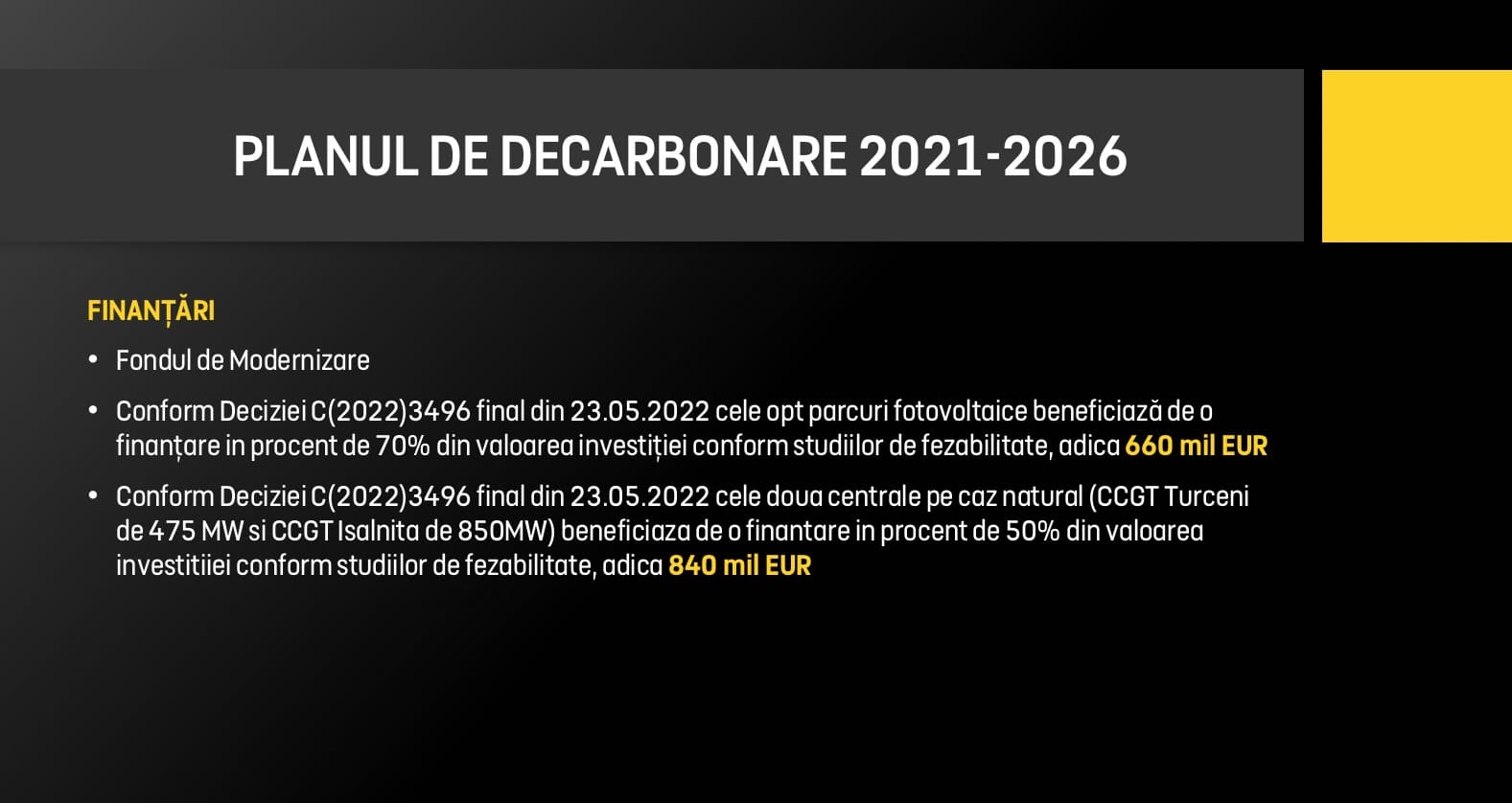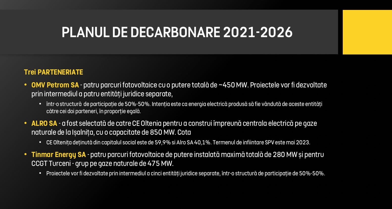 Peiu a adăugat că și proiectele de parcuri fotovoltaice, dezvoltate împreună cu OMV Petrom, sunt abia la stadiul depunerii ofertelor, fără termene clare. „Mai avem trei luni și se vor închide capacități în sumă totală de 1.000 de megawatti putere netă (…) Cu Alro SA și cu Tinmar Energy trebuiau construite două centrale electrice, vreo 1.300-1.400 de megawatti putere netă împreună. Suntem încă la stadiul de licitație. Nu s-a anunțat câștigătorul ofertei de construcție a centralei. Din momentul anunțării acestui câștigător, va mai dura undeva între 3-4 ani, în cel mai optimist scenariu, ca să se finalizeze cele două centrale.