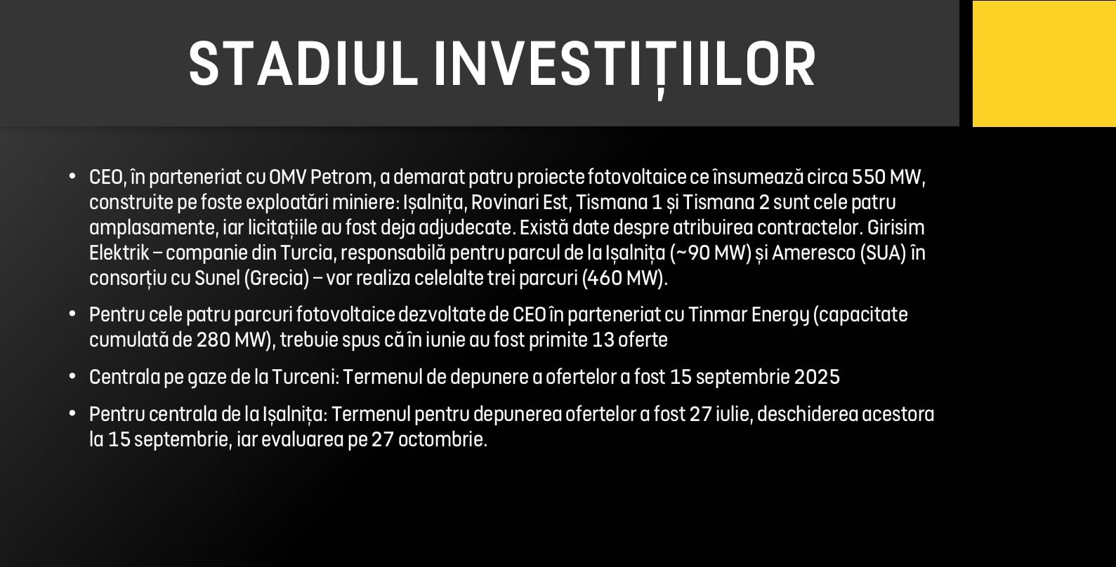 În ceea ce privește parcurile fotovoltaice care trebuiau dezvoltate cu OMV Petrom și cu alți parteneri, și aici suntem în stadiul în care s-au depus ofertele. Nu știm încă cine va face aceste parcuri fotovoltaice și când”, a avertizat acesta.