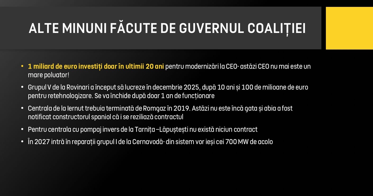 „Statul român a cheltuit un miliard de euro pentru modernizări și tehnologizări la Complexul Energetic Oltenia. Ultima sută de milioane cheltuită în ultimii 10 ani doar pentru grupul de la Rovinari (…) am băgat o sută de milioane, l-am modernizat și după un an, adică la 1 ianuarie 2026, va trebui închis. Vorbim despre faptul că centrala de la Iernut nu a fost finalizată, avem o întârziere de șase ani, trebuia finalizată în 2019, 430 de megawatti putere netă. Mai vorbim și despre proiectele de hidrocentrale rămase neterminate și blocate toate în instanță de ONG-uri de mediu”, a adăugat el.