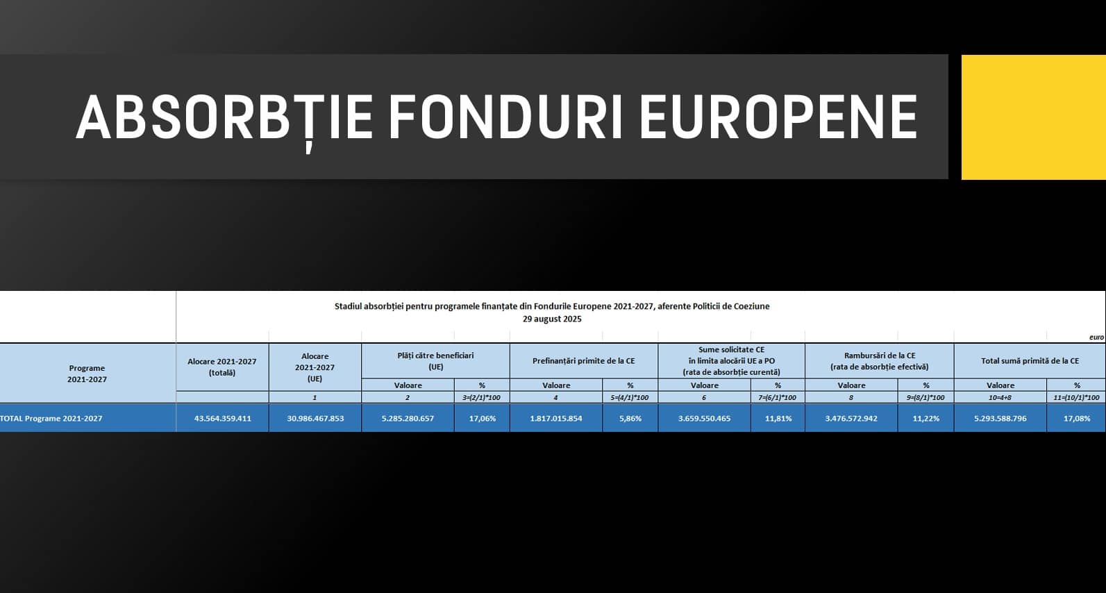 În privința fondurilor europene, Petrișor Peiu a arătat că România are o rata medie de absorbție de doar 17% în cadrul programelor naționale și regionale, deși toate proiectele trebuie finalizate până la 1 august 2026.