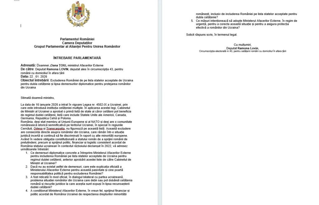 Cer public Președintelui României, Nicușor Dan, și Ministrului Afacerilor Externe, Oana Țoiu, să explice de ce România nu figurează pe lista statelor acceptate de Ucraina pentru dubla cetățenie, ce demersuri concrete au făcut pentru românii din Ucraina și de ce sprijinul financiar acordat Kievului nu a fost condiționat de respectarea drepturilor acestora. Cer asumarea răspunderii politice pentru acest eșec și inițierea de urgență a unor demersuri diplomatice ferme pentru includerea României pe această listă”, a declarat deputatul AUR, Ramona Lovin.